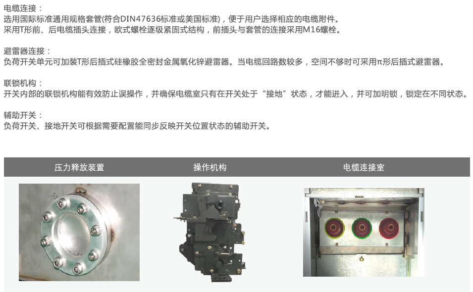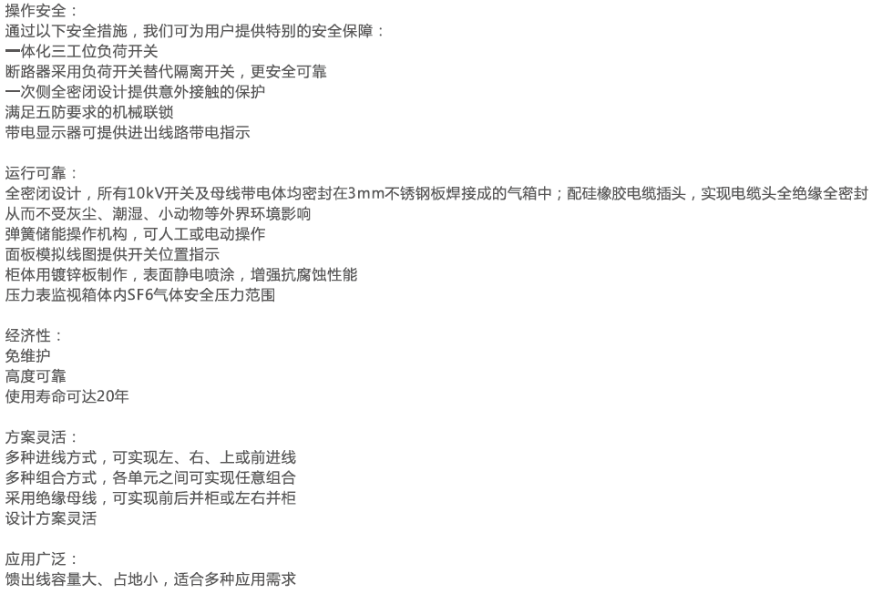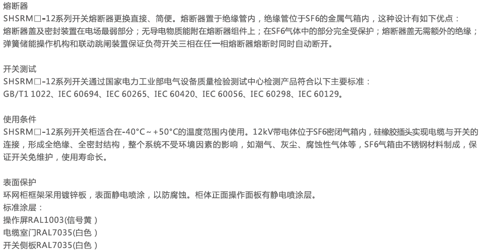 SRM 口-12系列环网开关柜是SF6气体绝缘的金属共箱式封闭开关设备,该设备可由负荷开关单元、负荷开关熔断器组合电器单元、真空断胳器单元、母结进结单元的模块组成.采用一系列先进技术和材料,具有优异的电气性能和机械性能,受环境和气侯影响小,体积小巧,易于安装,操作方便,无需维护,且具有灵活的组合方式.清晰直观的设计保证操作简单、直接.馈结接结容量大,适合多种接结系统.