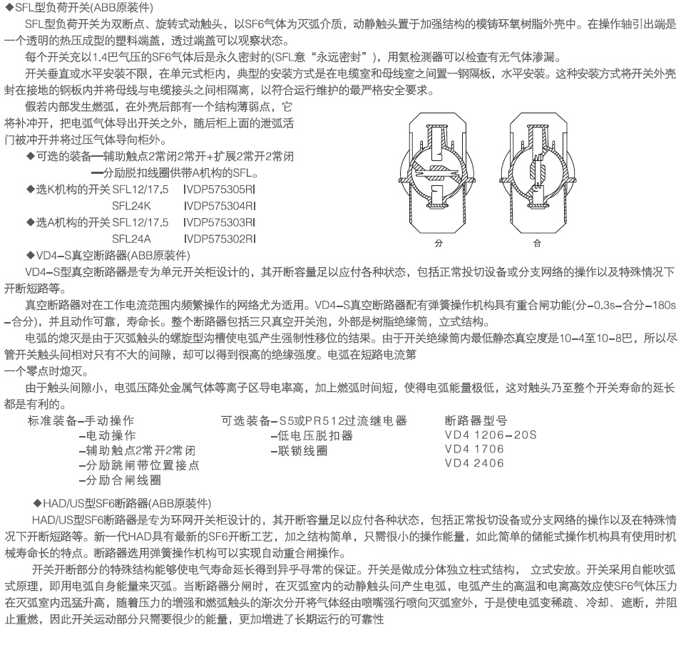 环网柜的主开关、操作机构及元器件采用ABB公司原装牛或采用进口部件国内组装生严的SFL-12/24型开关设备,也可根据用户需要配装ABB公司原装HAD/US型SF6. 断路器或VD4-S型真空断路器.真操作方式分为动、电动两种。